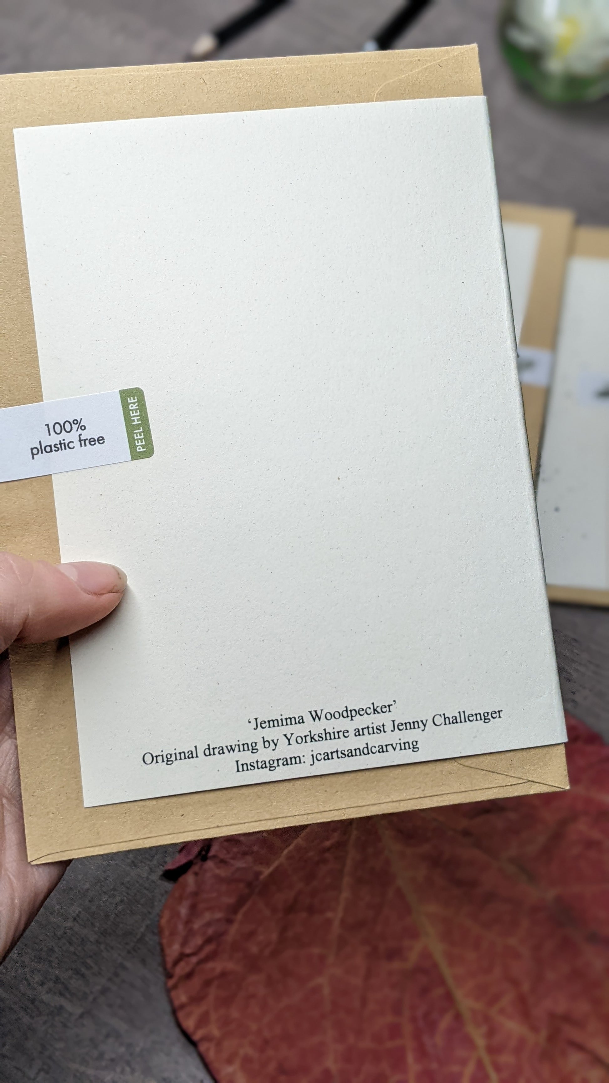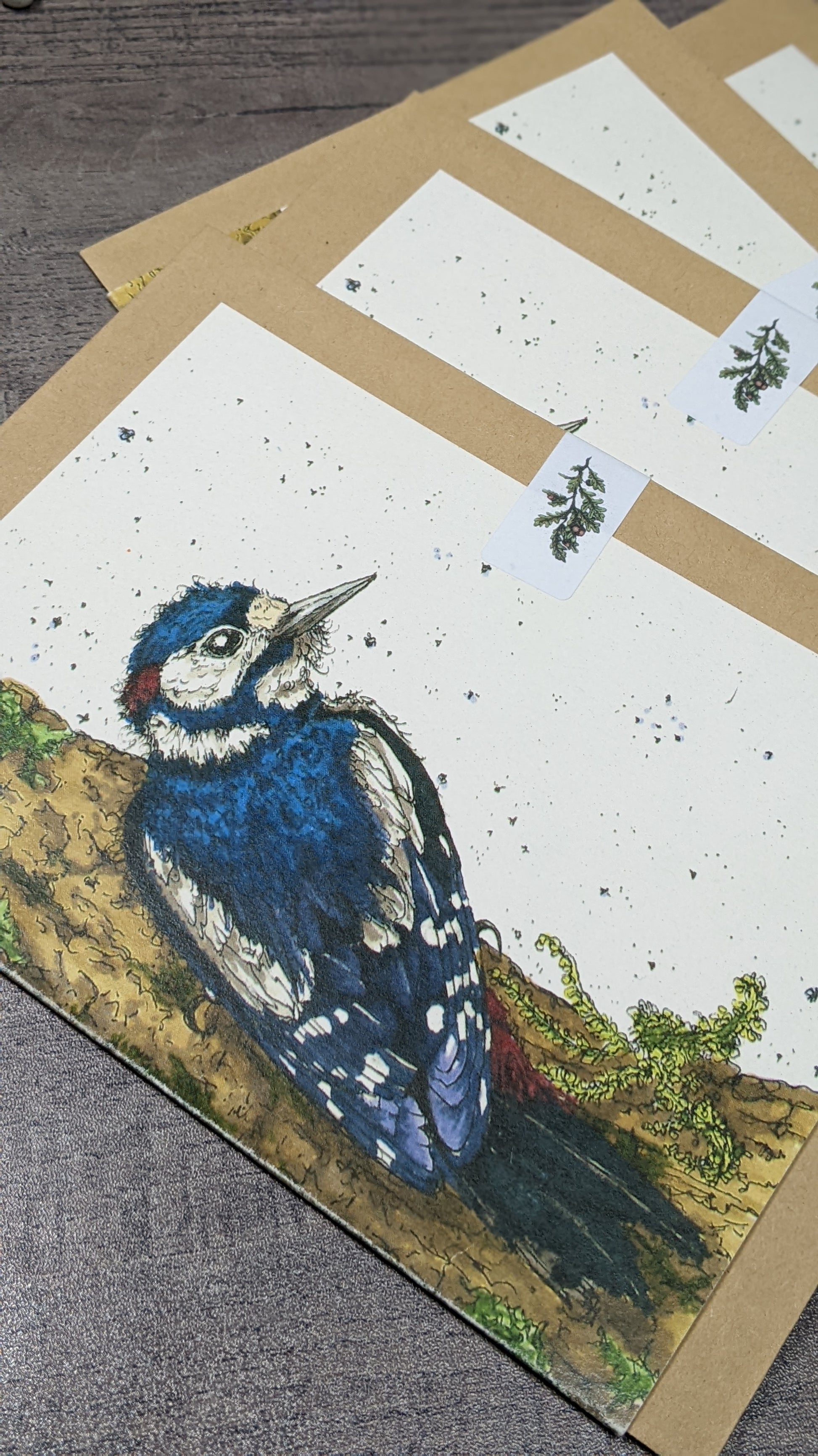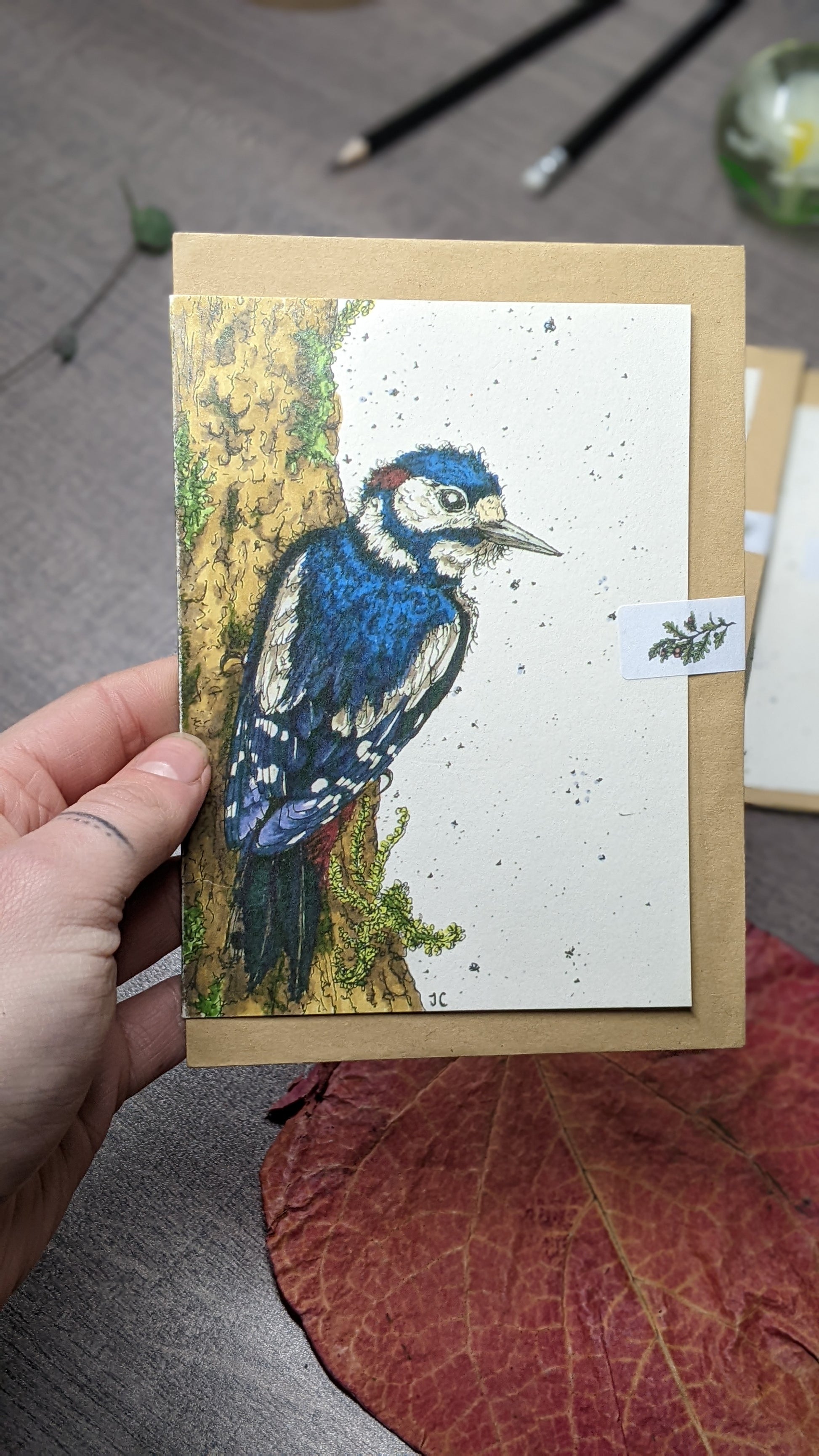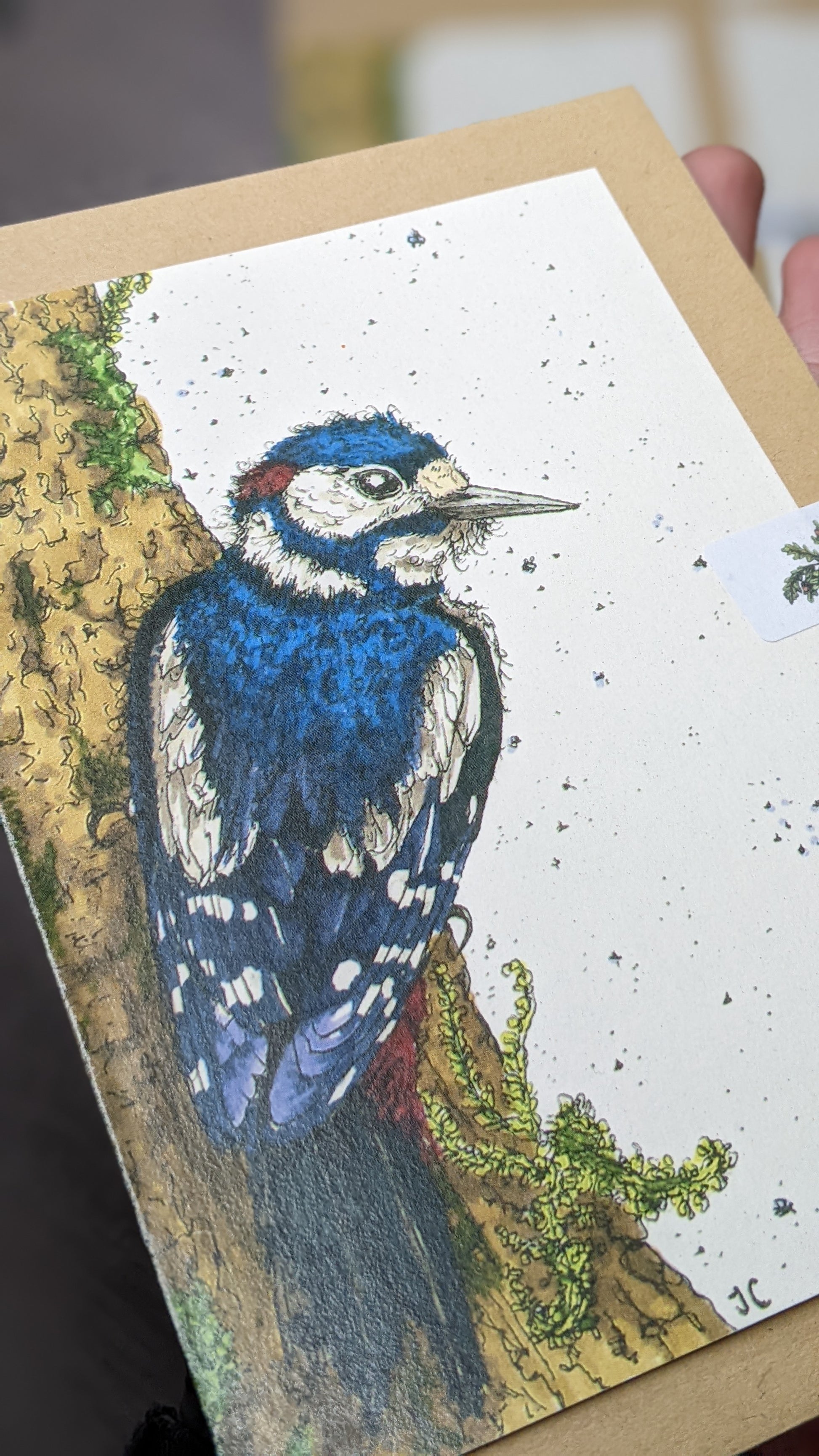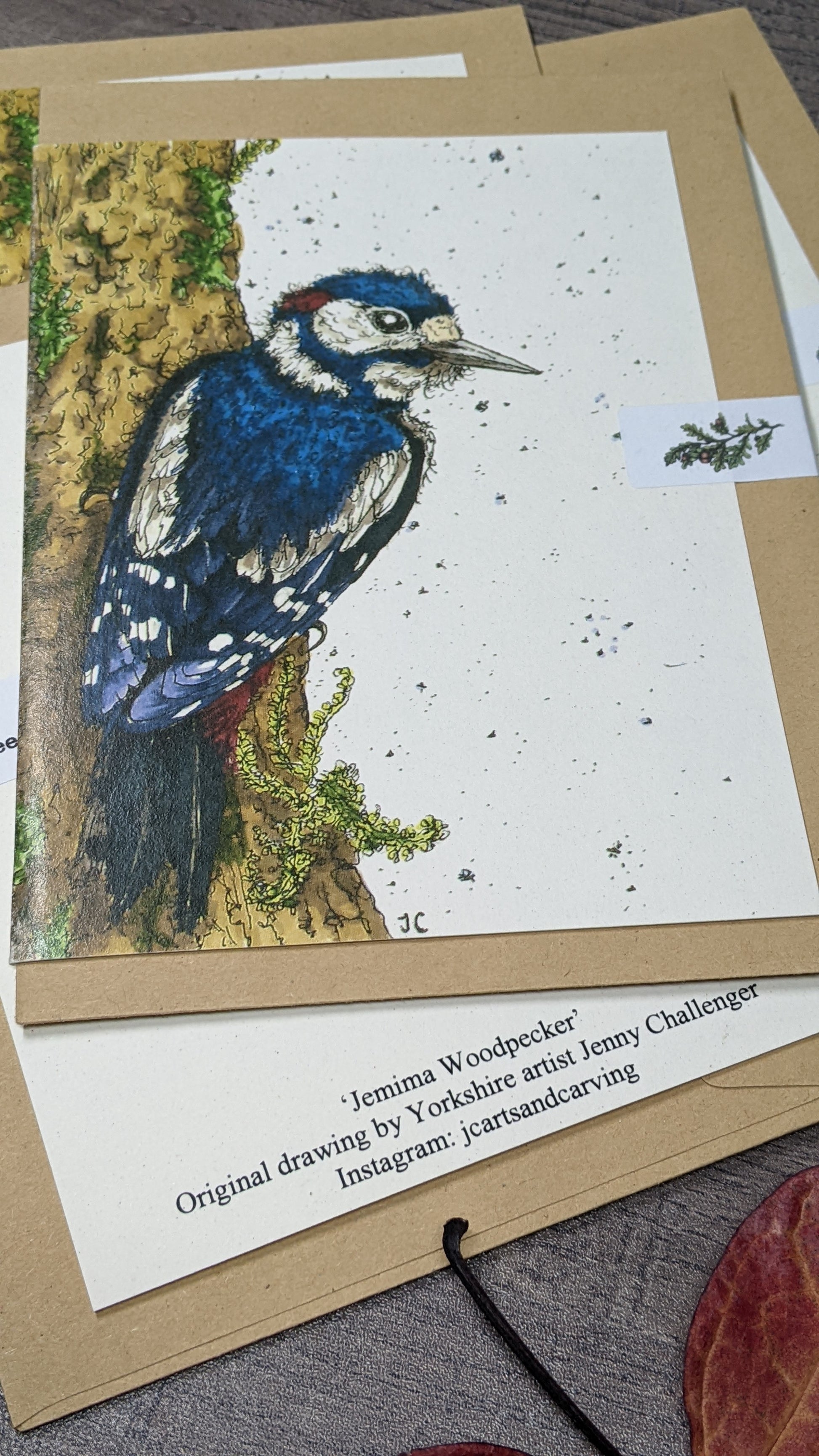 Greeting card printed on ivory card, from my original illustration "Jemima Woodpecker".