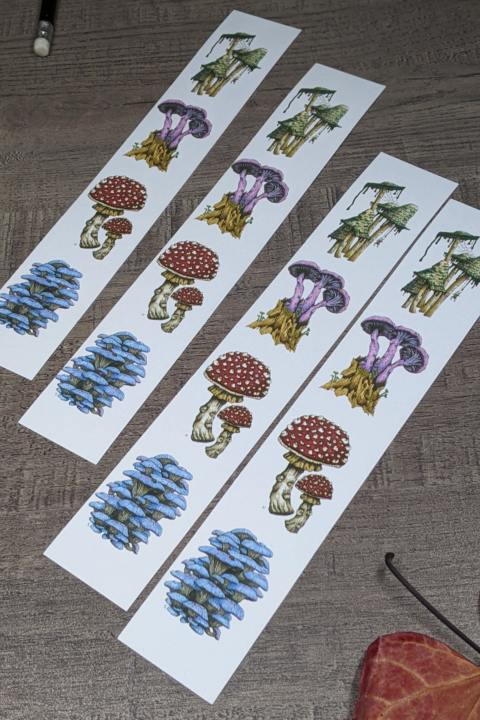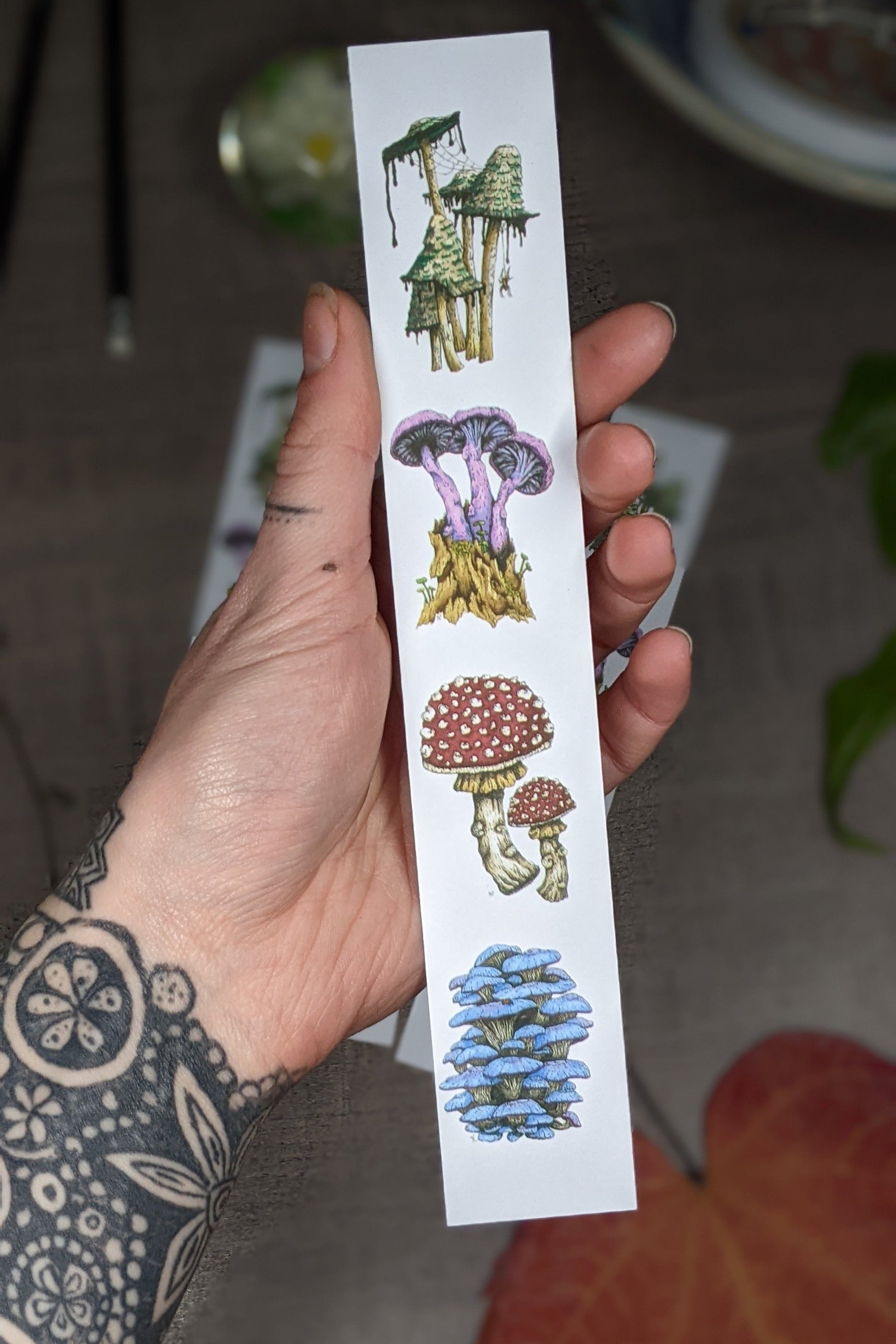 A bookmark with four of my illustrated mushroom designs on. Fly Agaric, Oyster Mushroom, Shaggy Ink Caps and Amethyst Deciever!