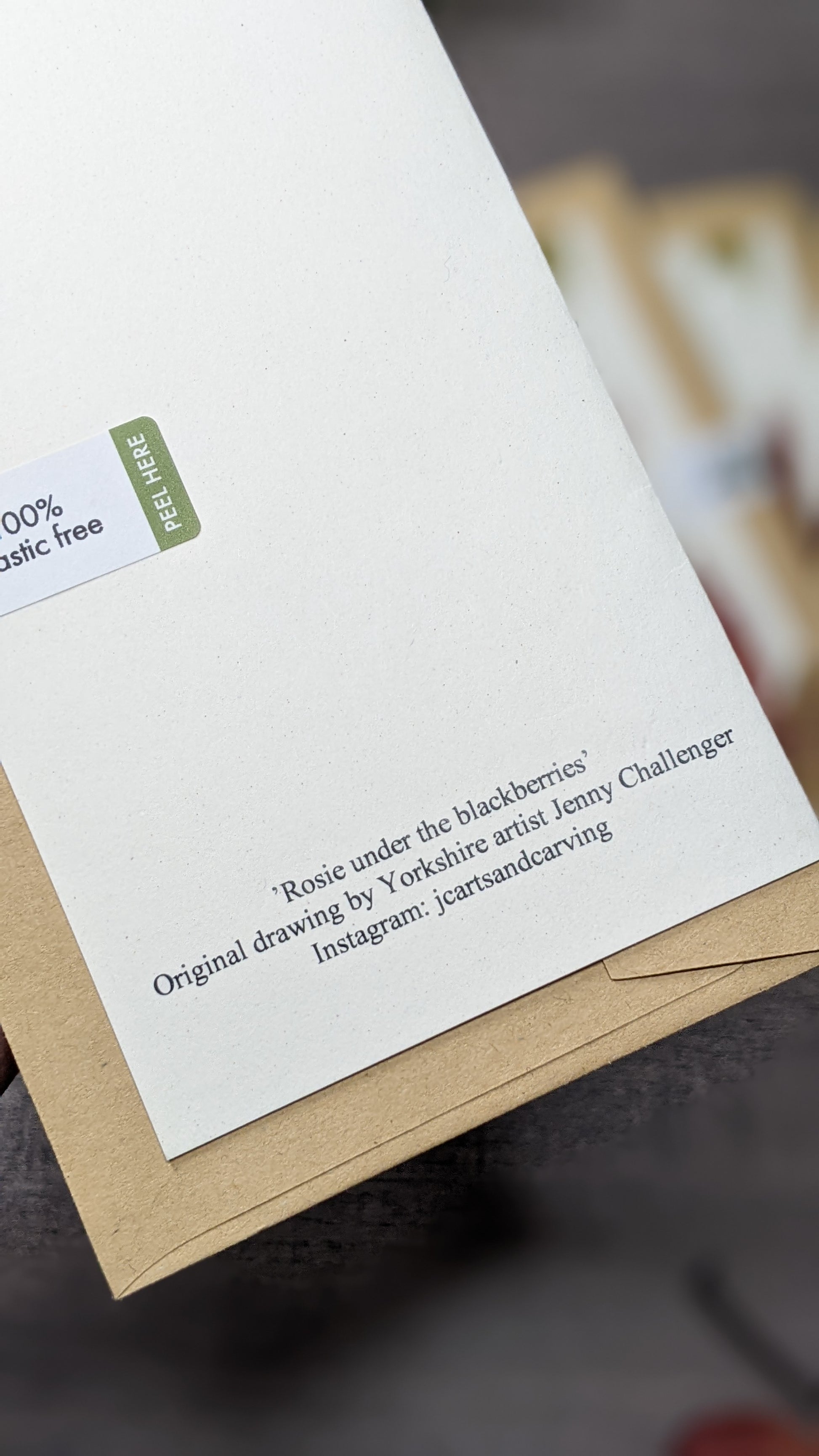 Greeting card printed on ivory card, from my original illustration "Rosie Under The Blackberries".